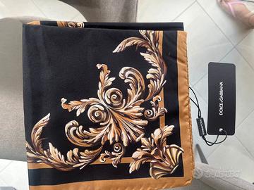 Elegante foulard quadrato 100% seta con sfondo nero intenso. Presenta una lussuosa e complessa stampa di volute barocche nei toni dell'oro pallido, bianco crema e marrone bronzo. L'intera composizione è incorniciata da un bordo a contrasto color marrone tabacco. Il design riflette l'opulenza classica e distintiva di Dolce & Gabbana.