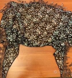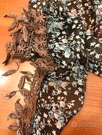 Elegante foulard da donna con una delicata fantasia floreale su sfondo marrone. I bordi sono rifiniti con un pizzo color rame che aggiunge un tocco di raffinatezza.