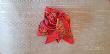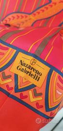 Foulard donna "Nazareno Gabrielli". Seta 100%. Dimensioni 86x86 cm. Colori rosso aranciato, giallo e blu. Articolo mai utilizzato, senza confezione di cartone.