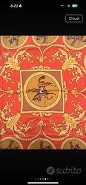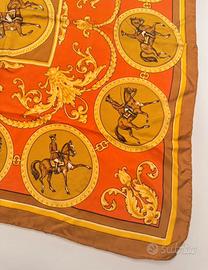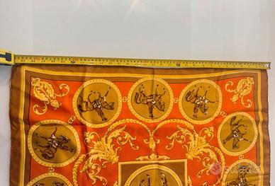 Questo foulard di Hermès 76cm circa è un pezzo che celebra l'equitazione classica, il cuore pulsante della tradizione della maison parigina. Il design raffigurato è il celebre "La Reale" o motivi simili legati all'Alta Scuola di Cavalleria. Composizione e Iconografia Il disegno è un inno alla precisione e all'eleganza equestre: • Il Quadrante Centrale: Un cavaliere in abiti settecenteschi esegue una figura di alta scuola, incorniciato da una bordura circolare decorata. • I Medaglioni Perimetrali: Lungo i bordi si sviluppa una serie di 12 cerchi, ognuno dei quali ritrae diverse andature e salti. È quasi un manuale d'equitazione illustrato su seta. • Decori Barocchi: Lo spazio tra i medaglioni è arricchito da eleganti volute dorate, foglie d'acanto e catene, tipiche dello stile barocco francese, che collegano visivamente ogni elemento. Palette Cromatica I colori scelti per questa versione sono caldi e autunnali, estremamente facili da abbinare: • Base: Un vibrante color corallo/terracotta che riscalda l'intero accessorio. • Dettagli: Un contrasto di oro antico e giallo ocra per le decorazioni barocche e l'interno dei medaglioni. • Cornice: Il bordo esterno in marrone bruciato (con un filetto giallo) conferisce una chiusura sobria e maschile al tempo stesso. Stile e Utilizzo Con una dimensione di 30 cm, questo foulard è il "piccolo grande" accessorio di lusso: • Piegatura: Se indossato come pochette, il modo migliore per valorizzarlo è la piega "a corona" o a "due punte", che permette di intravedere le teste dei cavalli o le volute dorate. • Carattere: È un pezzo che comunica una passione per la storia, l'arte e il mondo equestre. Perfetto per spezzare un look formale o per elevare una giacca sportiva. Un piccolo dettaglio di autenticità Su un Hermès originale, se osservi attentamente i bordi (gli orli), dovresti notare il tipico roulottage: l'orlo è arrotolato a mano verso il dritto del foulard e cucito con piccoli punti invisibili.