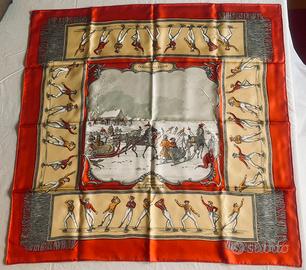 Il Foulard Hermès classico "Les Plaisirs du Froid" (I piaceri del freddo) è stato disegnato da Hugo Grygkar e lanciato per la prima volta nel 1955. Questa è una riedizione degli anni '90 in una splendida palette di rosso mattone, crema e azzurro cielo. Il termine "Carré d'art" (Quadrato d'arte), applicato al foulard Hermès, assume qui il suo pieno significato: si tratta di una vera e propria opera d'arte. La finezza del design, i dettagli, incorniciati da un vibrante rosso mattone, danno vita a questa scena di "piaceri del freddo" di un'altra epoca, con pattinatori sul bordo, una scena che non ci si stanca mai di guardare. Mai indossato, in con scatola originale. Molto raro e ricercato.