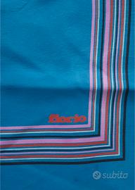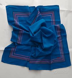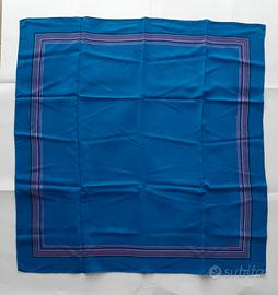 Foulard in pura seta FIORIO, degli anni '70, tessuto integro, morbido, colori vividi, sfondo blu acceso, con cornice a righe multicolori. Nota: nonostante sia intatto, sono presenti alcune macchioline visibili intorno al marchio FIORIO. Misure: cm 84 x 84.