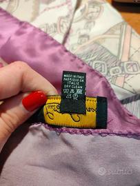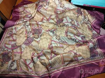 Elegante foulard con fantasia di borse e catene. Seta Misura 66x66