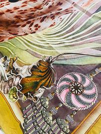 Foulard nuovo mai usato in viscosa, cm 130x140, molto morbido e piacevole al tatto. Fantasia scenografica con grande cavallo pezzato centrale e cornice decorativa nei toni del verde, giallo e rosa. Ampio, leggero e avvolgente, ideale da indossare come stola o foulard.