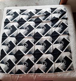 Presenta un motivo geometrico astratto a rombi con logo C di Chanel ben visibile.