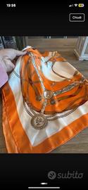 Bellissimo foulard quadrato in seta, un accessorio iconico che richiama l'eleganza classica. La fantasia è un raffinato motivo equestre e navale, bicolore bianco e arancione, con ghiere e cinghie in cuoio e medaglioni color oro lucido. Il design è pulito e sofisticato, perfetto per aggiungere un tocco di lusso a qualsiasi outfit. Si abbina magnificamente sia a un look formale che casual, ed è ideale per essere indossato al collo, legato al manico di una borsa o come accessorio per capelli Dettagli: • Materiale: Seta (morbida e lucente, come mostrato in foto sul manichino). • Colore: Bianco, Arancione, Oro lucido. • Forma: Quadrata. 65x65 • Taglia: L • Stile: Equestre / Nautico / Bon-Ton /
