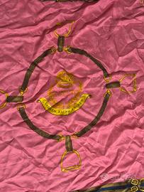 Elegante foulard Ralph Lauren in 100% seta, con un vivace motivo a tema equestre su sfondo rosa.