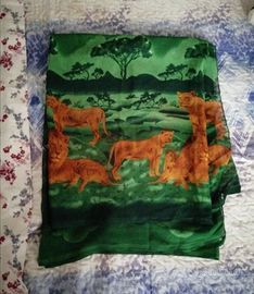 Foulard in velo semitrasparente ispirato al film Il Re Leone della Disney. Colore verde con la foresta, acacie leoni e leonesse e la scritta " Hakuna Matata", molto grande che potrebbe essere un arazzo. Misura cm 105 x cm 95 circa. . In perfette condizioni bello da indossare o da regalare...Vige assolutamente regola visto piaciuto e preso. No perditempo e affaristi grazie!!
