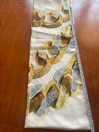 Bellissimo nuovo appena confezionato dalla mia sarta tessuto originale in pura seta con fantasia a catena d’oro . È’ stato fatto ad anello, per essere comodo da usare come una collana , evitando che scivoli il raso di seta.