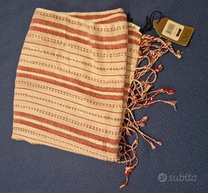 Foulard/sciarpa estiva (rettangolare), marca OVS, materiale: 99%viscosa, 1% fibra metallica, colore sfondo bianco con dettagli sul rosso e piccoli fili argento ( vedi foto).