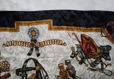 foulard stampato su tessuto jacquard come foto. fondo bianco - contorno blu. misura 85x85 cm. composizione 100%seta.