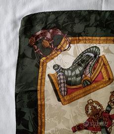 foulard stampato su tessuto jacquard come foto. fondo panna - contorno verdone. misura 85x85 cm. composizione 100%seta.