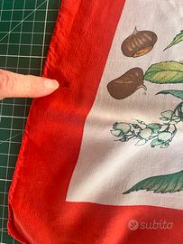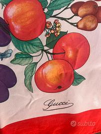 Foulard Gucci originale vintage in seta, con splendida stampa botanica e naturalistica raffigurante frutta, funghi, fiori e spighe, su fondo chiaro con bordo rosso iconico.