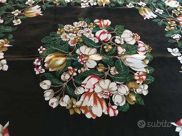 foulard fondo nero, bordo ruggine, con decoro a fiori che ricorda i lavori ad intaglio in malachite, madreperla ecc