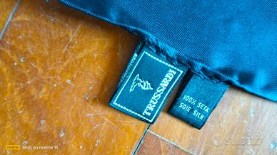 Questo raffinato accessorio è unfoulard vintage in setafirmatoTrussardi, caratterizzato dal celebre logo del levriero e dallo stemma del "Trussardi Racing Club". I foulard Trussardi di questo tipo sono pezzi da collezione molto ricercati nel mercato del second-hand e del vintage di lusso per la loro qualità artigianale e il design classico.