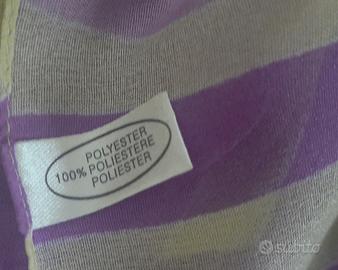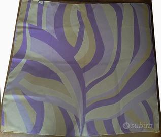 Elegante foulard quadrato con moderna stampa geometrica sui toni del viola, glicine e grigio/beige. Ideale da annodare al collo, come fascia per capelli o come accessorio per impreziosire il manico della tua borsa preferita. - Dimensioni: 50 x 50 cm. - Materiale: 100% Poliestere (tessuto leggero e resistente). - Fantasia: Motivi astratti/geometrici contemporanei. - Condizioni: Ottime, come da foto (presente etichetta di composizione). Un accessorio versatile per aggiungere un tocco pop e colorato al tuo outfit quotidiano. #foulard #viola #geometrico #accessori #vintage #chic #scarf #purple