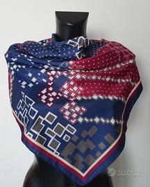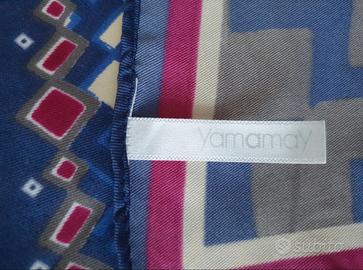 Mai adoperato, praticamente nuovo, foulard Yamamay, presumibilmente in seta, colori blu, bordeaux e viola, fantasie geometriche. Misure: cm 88 x 80.