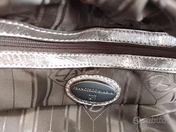 Francesco Biasia autentica handbag purse borsa con 2 manici in vera pelle color argento metallizzato, con due cerniere che si aprono dal centro verso l'esterno, interno capiente foderato con tessuto logato, tasca interna chiusa con cerniera lampo, cucitura a sopraggitto avorio sui manici, sacchetto antipolvere originale.