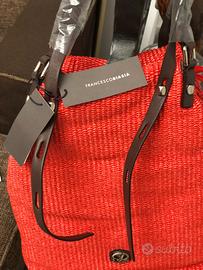 Di un vivace rosso corallo tracolla FRANCESCO BIASIA, in rafia e pelle, mai usata ancora con cartellino, modello primavera-estate.