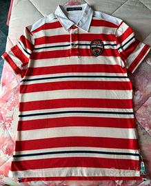 T-shirt polo marca Frankie Morello con stemma King of Speed hot racing team, beige a strisce rosse e nere e colletto bianco, tg L, nuova senza cartellino