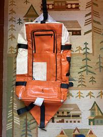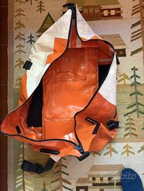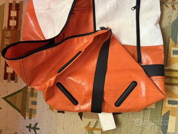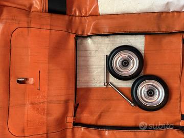 Marca: Freitag Modello: F733 Zippelin Condizione:Mai usata — Come nuova Materiale:Telone di camion riciclato, cinture di sicurezza, telaio in camera d'aria di bicicletta Dimensioni (gonfiata):85 × 42 × 25 cm Dimensioni (arrotolata):20 × 42 × 20 cm Volume:85 litri Peso: 3,6 kg Prezzo retail:€820 Il mio prezzo:€600 La prima borsa da viaggio gonfiabile al mondo. La Zippelin sostituisce il classico telaio rigido con una camera d'aria da bicicletta da 28 pollici — basta gonfiarla con una qualsiasi pompa a 2 bar e si ottiene un trolley da 85 litri a tutti gli effetti. Sgonfiata, si arrotola fino alle dimensioni di una bottiglia da 2 litri. Ingegneria geniale, puro Freitag. Le ruote rimovibili sono da 100 mm con anima in metallo, cuscinetti a sfera da skateboard e asse in acciaio inox a sgancio rapido. Nessun attrezzo necessario: si staccano al check-in, si ripongono nella tasca dedicata e si rimontano all'atterraggio. Le ruote di questo esemplare sono nuove, non hanno mai toccato terra. Realizzata in telone di camion che ha trascorso anni su strada: il materiale è naturalmente resistente, idrorepellente e collaudato per sopportare trattamenti bruschi. Ogni singola Zippelin è un pezzo unico — non ne esistono due uguali. La camera d'aria è facilmente sostituibile tramite uno scomparto con cerniera, e le ruote utilizzano componenti commerciali, quindi la manutenzione è semplice. Tre modalità di trasporto: impugnatura a una mano, tracolla, o trascinata sulle ruote. Scomparto principale con doppia zip, tasca posteriore ad accesso rapido e tasca frontale per passaporto e telefono. Sicura in aereo — non serve sgonfiarla nella stiva. Questo modello è stato prodotto in tiratura estremamente limitata ed è ormai praticamente introvabile. Acquistata a €820, mai portata in un solo viaggio. Condizioni impeccabili, zero segni d'uso. Vendo a €600.