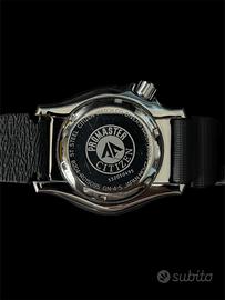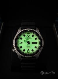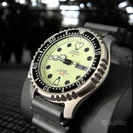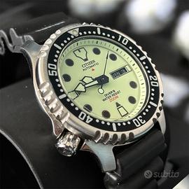 Citizen Promaster Full Lume automatico, iconico diver con quadrante completamente luminescente ad altissima visibilità. Monta bracciale originale in caucciù ed è in condizioni generali eccellenti, praticamente come nuovo. Da segnalare solo un piccolo graffio quasi impercettibile sul vetro in corrispondenza delle ore 11 e due lievi segni sul fondello. Per il resto l'orologio è impeccabile. Ancora in garanzia (acquistato nel 2025), completo di scatola e card. Referenza della serie NY0040-09W. Caratteristiche principali: Movimento automatico Quadrante Full Lume Impermeabilità 200 m Ghiera girevole unidirezionale Giorno/data Bracciale in caucciù originale
