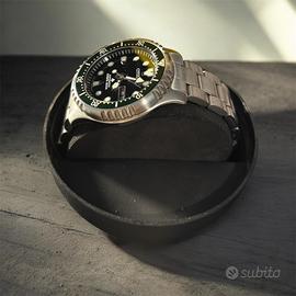 Orologio subacqueo professionale certificato ISO 6425, movimento automatico Miyota con carica manuale e hacking. Cassa e Bracciale in acciaio, diametro 42 mm, ghiera verde unidirezionale , impermeabile fino a 200 metri. FULL SET: scatola originale Citizen + garanzia + documentazione. Condizioni Pari Al Nuovo: segni di usura invisibili, indossato rarissimamente a rotazione con altri orologi della mia collezione. Sempre trattato con estrema cura. Seriale particolarmente ricercato, con: • corona logata Citizen • fondello satinato Dettagli molto apprezzati dai collezionisti e sempre più difficili da trovare. Orologio robusto, affidabile e iconico, perfetto sia per uso quotidiano che sportivo/subacqueo.