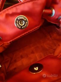 Furla piccola borsa a mano stile baguette. Raffinata in raso rosso e manici in pelle verniciata. Lievissimi e impercettibili segni di usura.