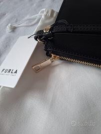 Misure: 25cm x 14 cm, lunghezza polsiera 17,5cm. Metallature color oro chiaro, recanti tutte il marchio Furla. Chiusura con zip, ha una tasca interna con applicato logo Furla stampato su pelle e 6 scomparti per carte di credito. Venduta con custodia originale con logo Furla stampato su fondo nero. Nuova, mai utilizzata e con cartellino originale.