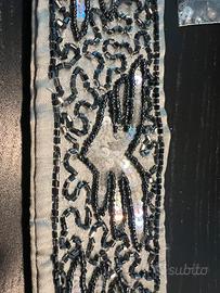 Eleganti fusciacche realizzate a mano, impreziosite da un raffinato ricamo con perline e strass nei toni del blu, turchese e nero su base chiara. Ogni pezzo misura 140 cm di lunghezza per 6,5 cm di altezza, perfetto per aggiungere un tocco artigianale e originale a capi d’abbigliamento, costumi o accessori.