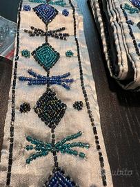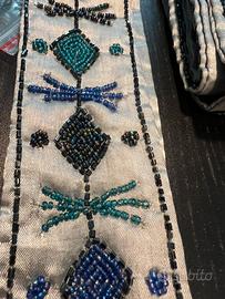 Eleganti fusciacche realizzate a mano, impreziosite da un raffinato ricamo con perline e strass nei toni del blu, turchese e nero su base chiara. Ogni pezzo misura 140 cm di lunghezza per 6,5 cm di altezza, perfetto per aggiungere un tocco artigianale e originale a capi d’abbigliamento, costumi o accessori.