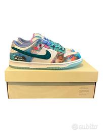Realizzate in pelle premium e suede, queste Dunk Low si distinguono per i loro pannelli in Bleached Aqua e dettagli in Geode Teal, creando un contrasto vibrante e originale. Le firme artistiche di Futura sulla linguetta e sul tallone rendono ogni paio unico e collezionabile.