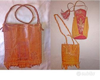 - una della Pelletterie Artistiche GA Mereu. Realizzata in vera pelle. Trasporto a spalla. Un solo vano centrale. Chiusura a stringa. Misure base cm 29x7, altezza cm 31. Ottime condizioni di stato. Euro 20.