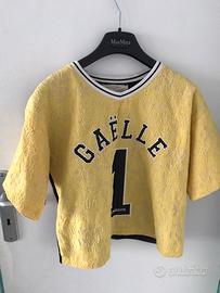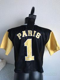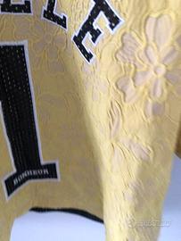 Maglia modello football americano in un particolare tessuto misto cotone poliestere, daMascate a fiori gialli anteriormente e a retina nera posteriormente con numero uno e logo a contrasto, creando un particolare effetto negativopositivo.taglia uno, veste dalla S alla L, poiché è molto ampia.ottimo stato #Gaelle #gaelleparis