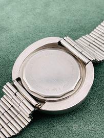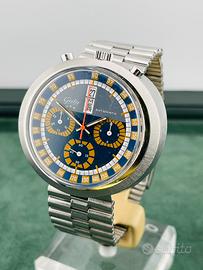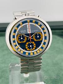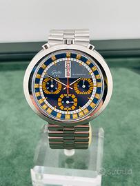 Strepitoso e raro Gala “Bull Head” cronografo automatico a tre contatori, prodotto negli anni '70, con cassa asimmetrica in acciaio da 46 x 43mm e pulsanti cronografici "cornuti". Particolare quadrante a più toni (blu, grigio e arancio) con doppia finestrella day-date, sfere a bastone di colore bianco e nero, vetro plastica e movimento meccanico a carica automatica su base Valjoux 7750.