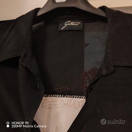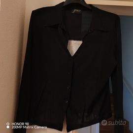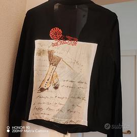 Camicia leggera morbida in viscosa-acetato nera di Gattinoni , caratterizzata da una grande immagine astratta a fondo beige sul retro, liscia sul davanti. Maniche lunghe senza polsini. Elegante e particolare. Taglia 46