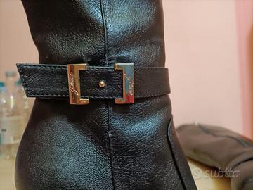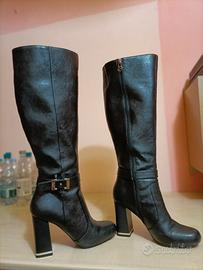 -Gattinoni- Stivali donna alti in pelle , neri , tacco 90mm , con fibbia alla caviglia , con cerniera ed elastico al bordo superiore . Numero 37 . Adatti per una donna alta almeno mt.1,65 . Usati pochissimo , come nuovi , € 50,00 .