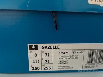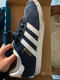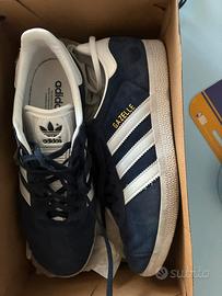 Gazelle blu misura 41 1/3. Articolo usato solamente due volte, scarpe come nuove. Presente anche lo scatolo. Aggiunta di lacci bianchi di ricambio