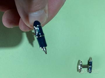 Particolari gemelli da camicia smaltati di cole blu notte a forma di penna stilografica.