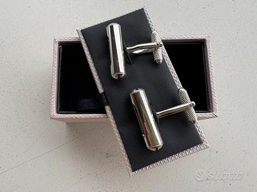 Gemelli in acciaio della ditta inglese Onyx Art London, con all’ interno una piccola clessidra, confezionati in scatola grigio/argento con il logo Onyx-Art London