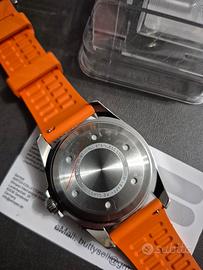 Edelstahl 316 L Vetro zaffiro antiriflesso Lunetta in ceramica nera, arancione con materiale luminescente BGW9 Fondello della cassa avvitato. Testato sotto pressione fino a 30 ATM