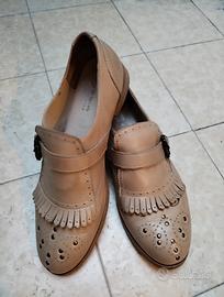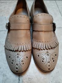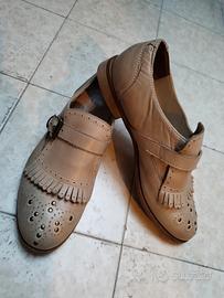 - scarpe basse, modello mocassino. Mascherina su tomaia, con frange e fibbia laterale. Piccole borchie su tomaia. Interamente in pelle, made in Italy. Marca Alissia numero 38. Utilizzate 3-4 volte, praticamente nuove. €13