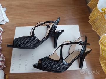 GEOX D Donyale Woven leather + Patent leather sandali slingback neri n.37,5 in pelle intrecciata e vernice, con cinturino incrociato, membrana traspirante e impermeabile, suola forata in gomma, tacco medio cm 7, NUOVI, MAI usati, con scatola originale e sigillo del venditore. Tecnologia brevettata della suola traspirante Geox, schiuma speciale con memory nell'intersuola.