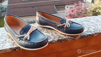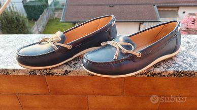 Geox Donna Mocassini Donna n°36- Come Nuovi (indossati 2 volte) Vendo bellissimi mocassini da Donna firmati Geox, n°36, color blu navy con raffinati dettagli e lacci a contrasto color panna. Le scarpe sono in condizioni impeccabili, praticamente pari al nuovo. sono state acquistate e indossate soltanto 2 volte, come si può chiaramente vedere dalle foto della suola e dell'interno. Caratteristiche Marca Geox (qualità e traspirabilità garantita) Materiale Vera pelle di alta qualità. Colore Blu scuro con finiture chiare. Taglia n°36, Comfort suola in gomma antiscivolo brevettata Geox che permette al piede di respirare. Ideali per la primavera/estate, perfette sia sotto Jeans che con un abbigliamento più formale da ufficio. Pagamento in contanti alla consegna presso mio domicilio, o nelle immediate vicinanze.