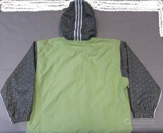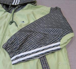 Giacca a vento Adidas vintage degli anni '90, caratterizzata da un raro design multicolore. La giacca è prevalentemente verde lime con maniche e inserti del cappuccio a fantasia tweed in toni di grigio e bianco.