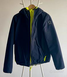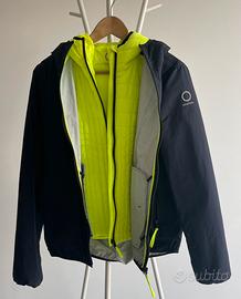 tessuto tecnico, brand logo, fantasia bicolore, collo con cappuccio, monopetto, maniche lunghe, interno sfoderato, zip, multitasche, modello antivento