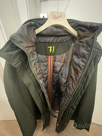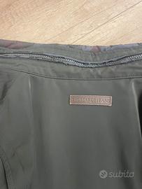 Giacc a vento sportiva Trussardi. Interno Trapuntato con fantasia Camouflage. Colore Verde, Taglia 54. Doppia chisura, panciotto interno con cerniera e chiusura esterna anche con bottoni logati Trussardi. Cappuccio arrotolato all’intero della cerniera sul retro del colletto. Segni di usura soprattutto sulla copertura similpelle dell cerniera sul colletto, e anche leggermente visibili sulla tasca destra.