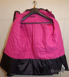 Giacca a vento nera con fodera fucsia di pile, cerniera e bottoni tg 46. Cappuccio chiuso dentro il collo. Wed'ze della Decathlon.