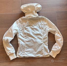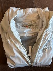 Giacca a vento bianca. 3 tasche nel fronte, con zip. Interno felpato. Cappuccio removibile.