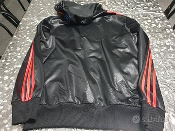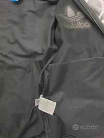 bellissima giacca Adidas Chile 62 con cappuccio, taglia S, colore nero con strisce laterali arancione, loghi multicolore, interno del cappuccio arancione, tasche laterali con cerniere, usata pochissimo, nessun difetto ne segni di usura